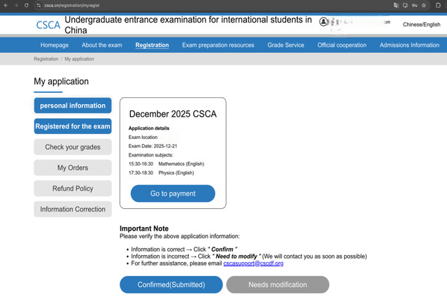 Special Note: Applicants may initially fill in their personal information on the online platform and upload a “CSCA registration confirmation/screenshot” as a placeholder. However, an official CSCA score report must be submitted no later than June 10. Failure to do so will result in the application not advancing to the review stage. (Sample image attached.)