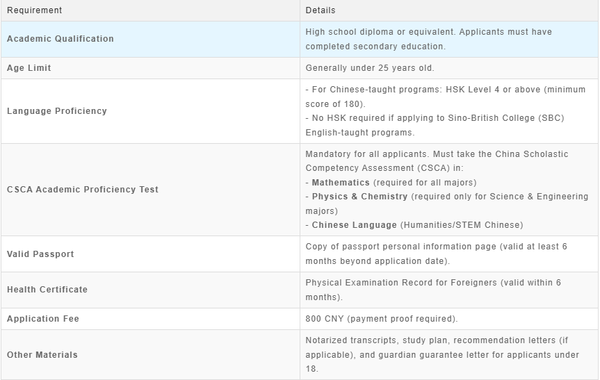 For undergraduate program applicants, it is mandatory to submit a China Scholastic Competency Assessment (CSCA) Test Report, which typically covers subjects such as Mathematics, Physics, Chemistry, and Humanities Chinese or STEM Chinese.
